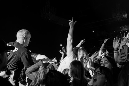 At 9:40pm, the lights dimmed as the venue boomed with cheers, anticipating the headlining act. A giant shamrock-shaped light lit up on the stage, and soon enough, Grayscale walked in as the crowd continued cheering. They opened with their hit “Kept Me Alive” from their latest album The Hart, a high-energy pop-rock track that instantly got the fans moving. As soon as the song began, a constant wave of crowdsurfers surged through the room, which continued almost nonstop for the entire first three songs. With frontman Collin Walsh’s dynamic vocals, electrifying riffs from guitarists Dallas Molster and Andrew Kyne, and vibrant drum lines from drummer Nick Veno, Grayscale creates an immersive soundscape that encourages anyone to get off their feet and become lost in the music. Not a single fan in the venue was standing still; everyone was moshing, crowdsurfing, or jumping along.