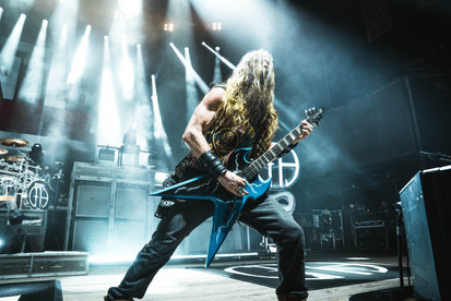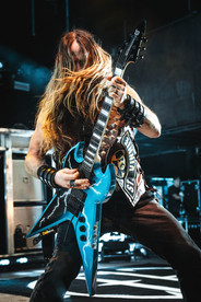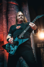 Next up was the legendary melodic death metal band, Amon Amarth. Hailing from Stockholm, Sweden, Amon Amarth has been singing songs about Viking mythology and Viking history through pure death metal since forming in 1992. The band is currently signed to Metal Blade Records and consists of Johan Hegg (vocals), Olavi Mikkonen (guitar), Johan Söderberg (guitar), Ted Lundström (bass) and Jocke Wallgren (drums). Powerful classical music filled the room with anticipation for the band's arrival and as each member appeared on stage, we realized we had come face to face with the "Guardians of Asgaard". Jones Beach was greeted with thunderous guitars from Mikkonen and Söderberg that shook the whole place and I felt the beefy double bass from Wallgren in my chest. The next song "Shield Wall" saw two Vikings making their way on stage to stand on two platforms to raise their shields up high forming the "Shield Wall" that Hegg commanded. Hegg then told the crowd it was time to party like Vikings as it was "The Pursuit of Vikings" and the fans proceeded to party like Vikings would. Johan Hegg is one of the most powerful vocalists in death metal. His Thor-like growls, striking stature and commanding stage presence would make anyone stop what they're doing and pay attention to him. He for sure had the presence of a God whenever he stepped on stage. The performance of "Put Your Back Into the Oar" saw the pit doing the one thing Amon Amarth is known for creating, the famous "row pit" where everyone in the pit would sit down and row their arms back and forth like they are in a boat. Right at the song's bridge, at the command of Hegg, the pit opened up as people sat on the floor and started rowing as Hegg kept chanting "ROW! ROW! ROW! ROW!" After ripping through the new song "We Rule The Waves" we saw the same Vikings we saw earlier return to the stage and battle each other till one emerged victorious during "The Way of Vikings".